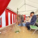 地鎮の儀では、施主であるM工業様の社長様に鍬で土起こしを行っていただきました。