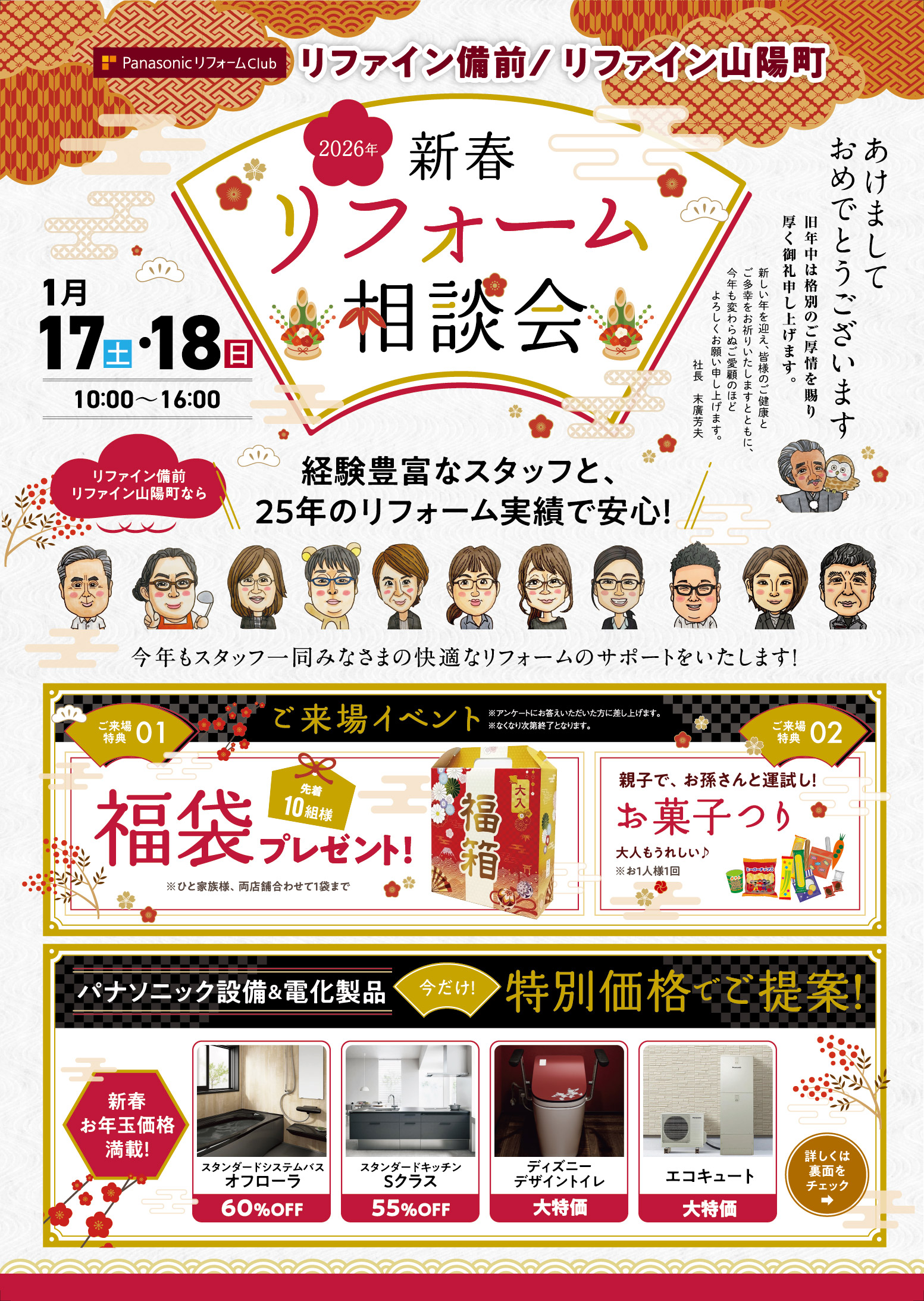 来年2026年もリファイン備前とリファイン山陽町にて、1月に毎年恒例の「新春リフォーム相談会」を開催いたします!