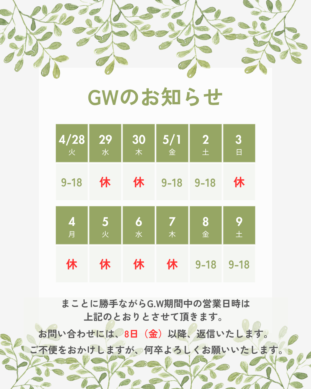 4/28(火) 9:00~18:00 4/29(水) 休 4/30(木) 休 5/1(金) 9:00~18:00 5/2(土) 9:00~18:00 5/3(日) 休 5/4(月) 休 5/5(火) 休 5/6(水) 休 5/7(木) 休 5/8(金) 9:00~18:00 5/9(土) 9:00~18:00