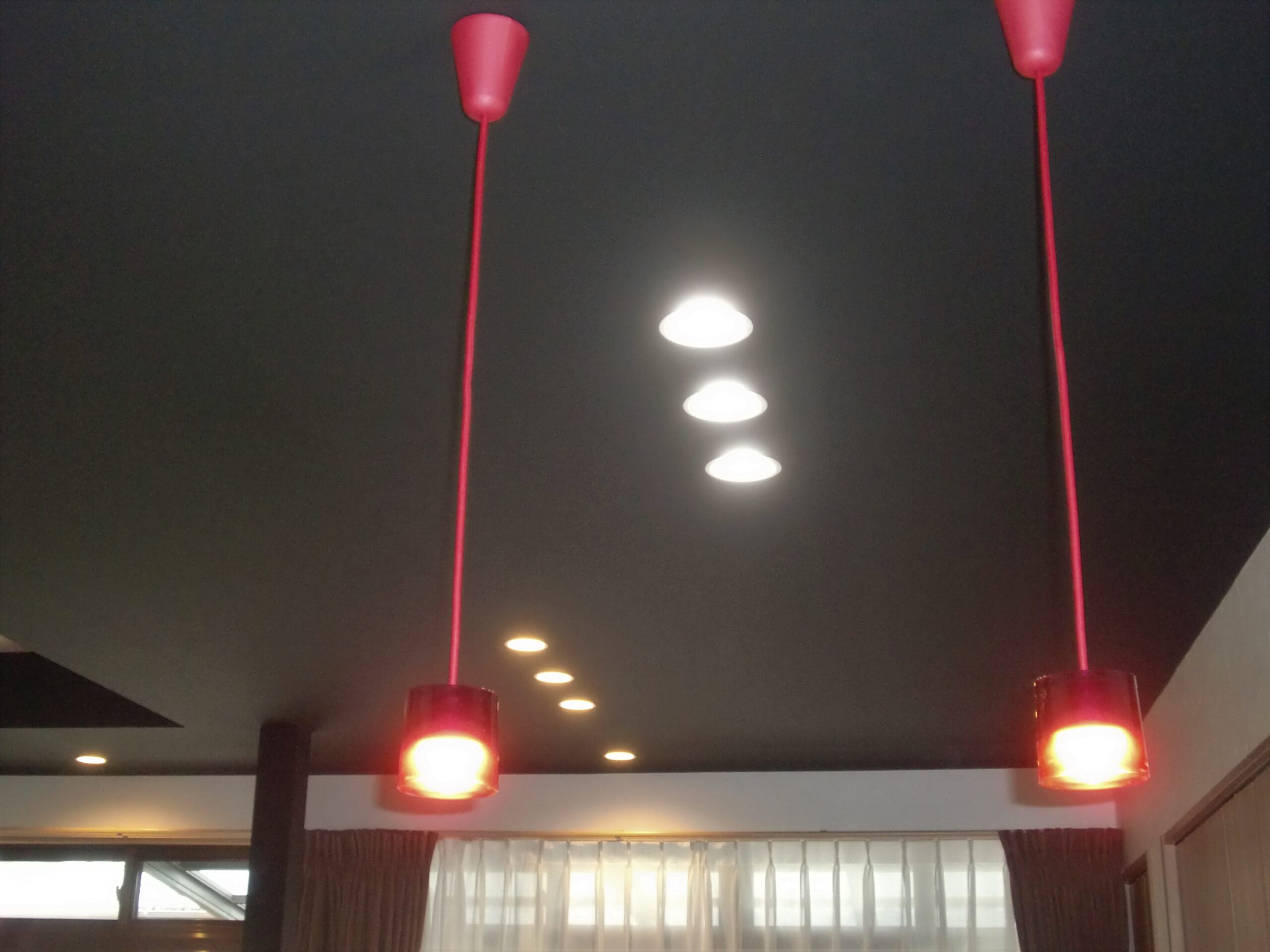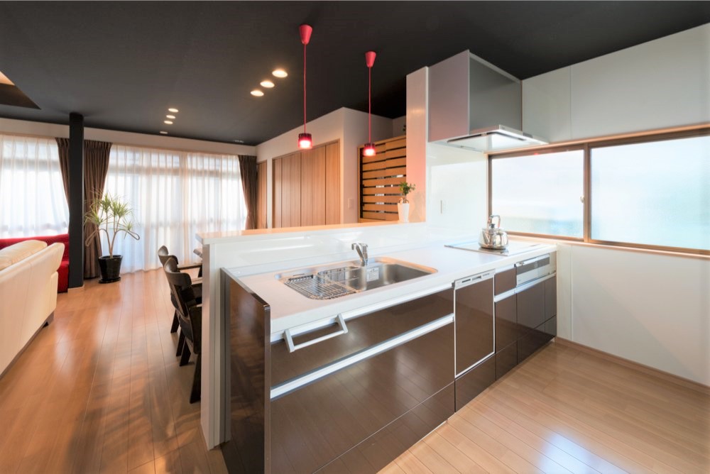 憧れだった対面キッチンダイニング。お孫ちゃんの顔を見ながらお料理できます。赤をポイント色にして欲しいとのご要望でペンダント照明を赤に!